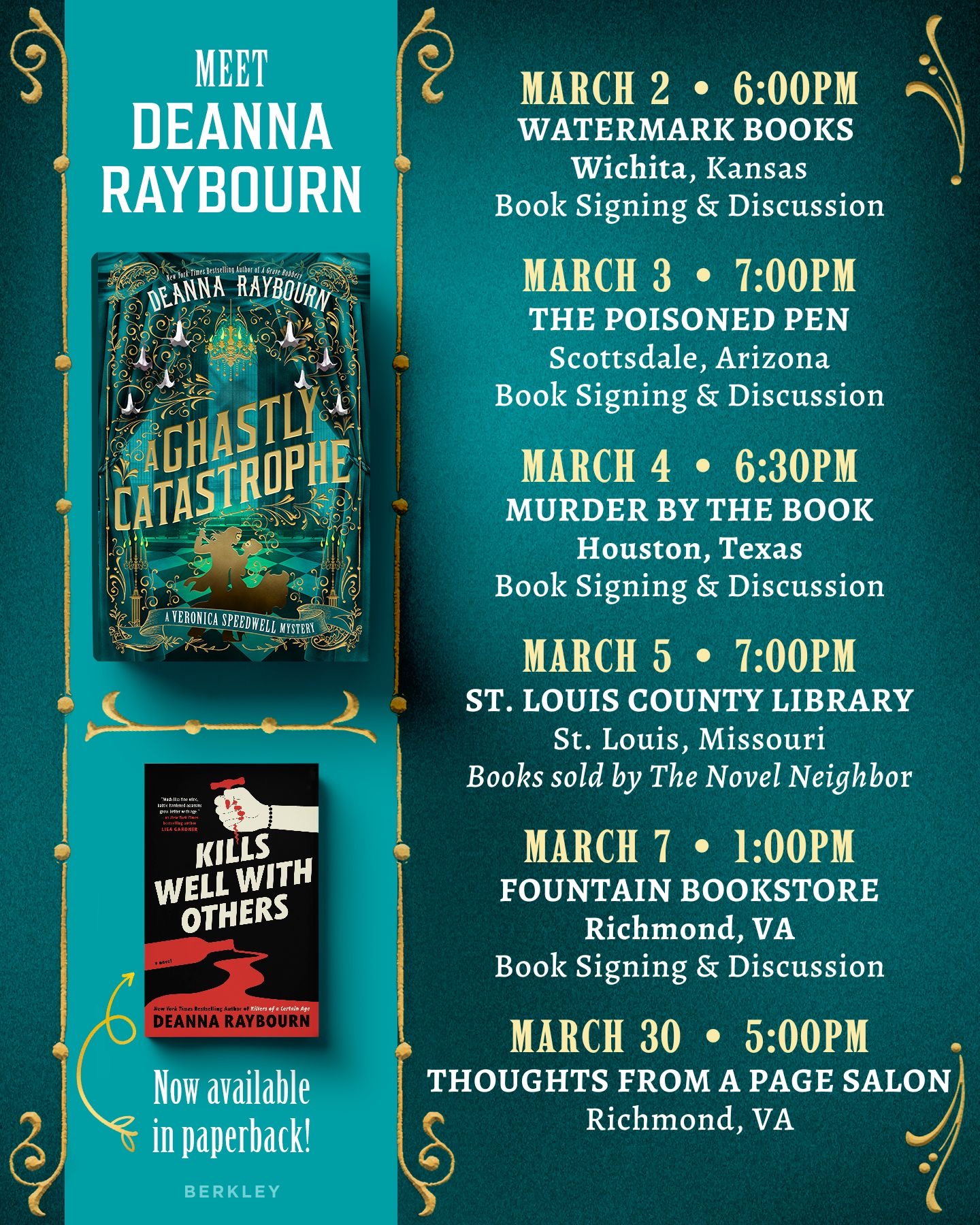 Here are the dates and places of the book tour for A GHASTLY CATASTROPHE and KILLS WELL WITH OTHERS (paperback). If you can’t make it, please remember that all of these fine bookstores are happy to ship signed copies as long as you order in advance. Hope to see you there!